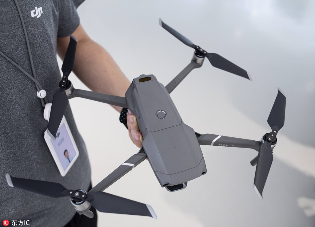 An employee holds the DJI Mavic 2 Pro drone at a DJI flagship store, Aug 24, 2018. [Photo/IC]