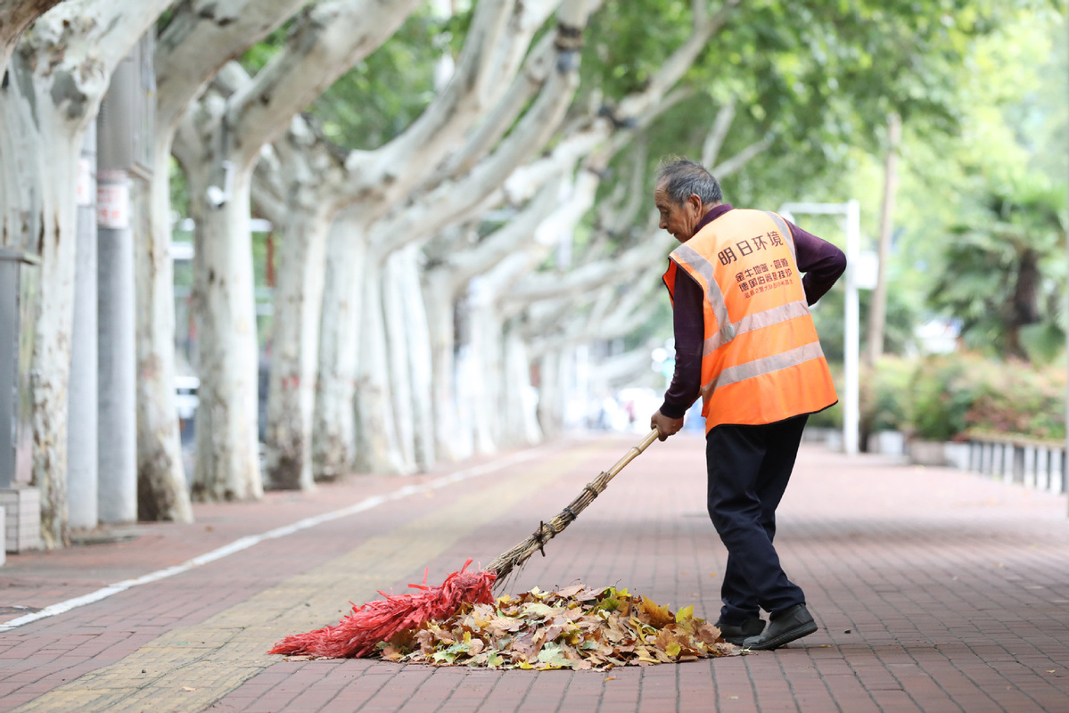 A sanitation worker cleans fallen leaves in Wenxian county, Jiaozuo city, Central China's Henan province, Oct 2, 2025. Workers from all walks of life have been standing fast at their posts and fulfilling their duties with full dedication during the eight-day National Day and Mid-Autumn Festival holiday. [Photo/Xinhua]