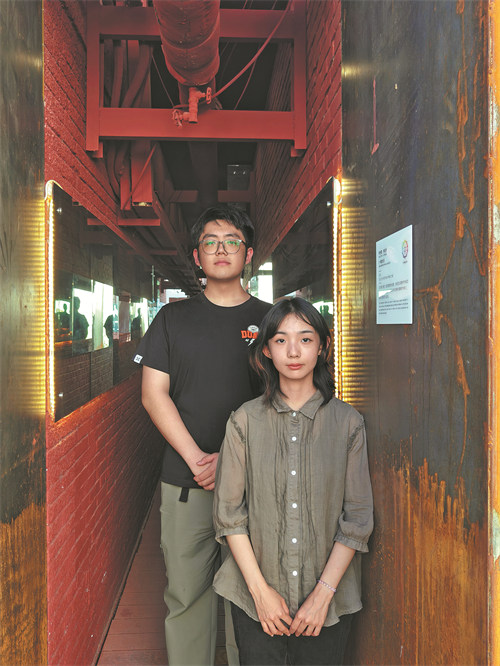 The designers of the installation inside a corridor in the village titled One Mirror, Myriad Worlds. The two designers are university students at the time of finishing the artwork. [Photo provided to China Daily]