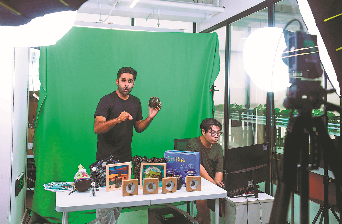 A Pakistani livestreamer makes a sales presentation in the streaming room of an internet information industrial park in Haikou, Hainan province, on Sept 22. ZHENG YUE/XINHUA