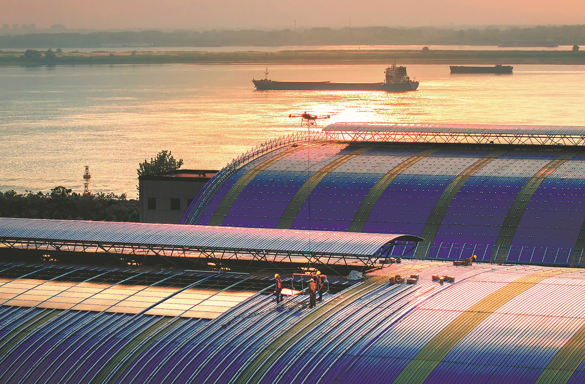 Employees use a drone to maneuver photovoltaic panels for installation on the roof of a coal shed in Ma'anshan, Anhui province, on May 5, 2025. ZHANG MINGWEI/FOR CHINA DAILY