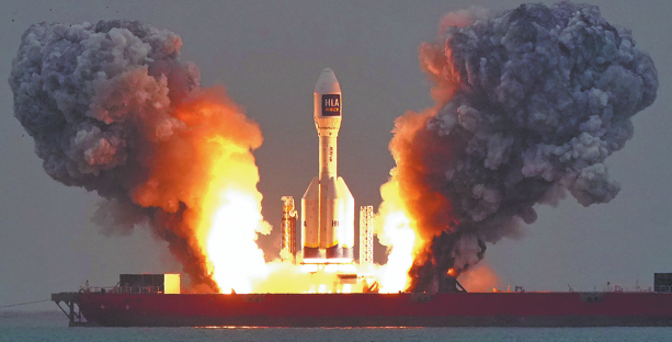 The 30-meter-tall rocket lifted off at 10:20 am from a launch vessel off the coast of Haiyang in Shandong province and soon placed its payloads — an optical remote-sensing satellite and two experimental satellites — into their preset orbits.