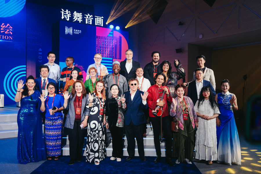 Guests pose for a group photo at the World Poetry Dance Music and Visual Arts Salon in Liangzhu of Hangzhou, East China’s Zhejiang province, on Oct 18, 2025. [Photo provided to chinadaily.com.cn]