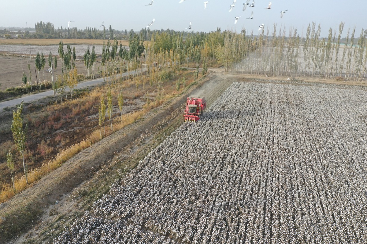 An aerial drone photo shows a cotton picker operating in a field in Xayar county of Aksu, Northwest China's Xinjiang Uygur autonomous region, Oct 21, 2025. The harvest season of cotton has started in Xayar county. [Photo/Xinhua]
