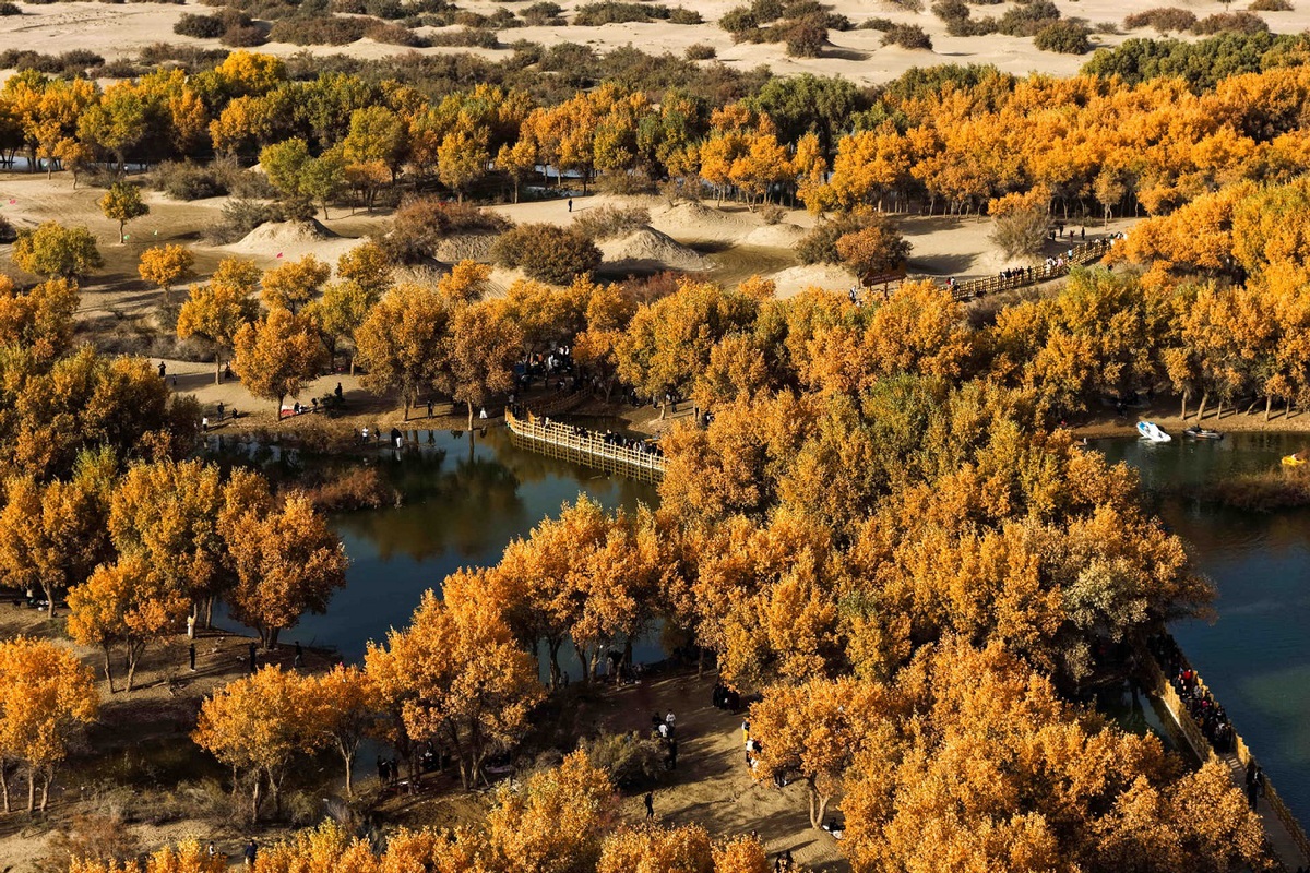 An aerial drone photo taken on Oct 19, 2025 shows tourists enjoying the scenery of populus euphratica forests in Lop county of Hotan prefecture, Northwest China's Xinjiang Uygur autonomous region. [Photo/Xinhua]