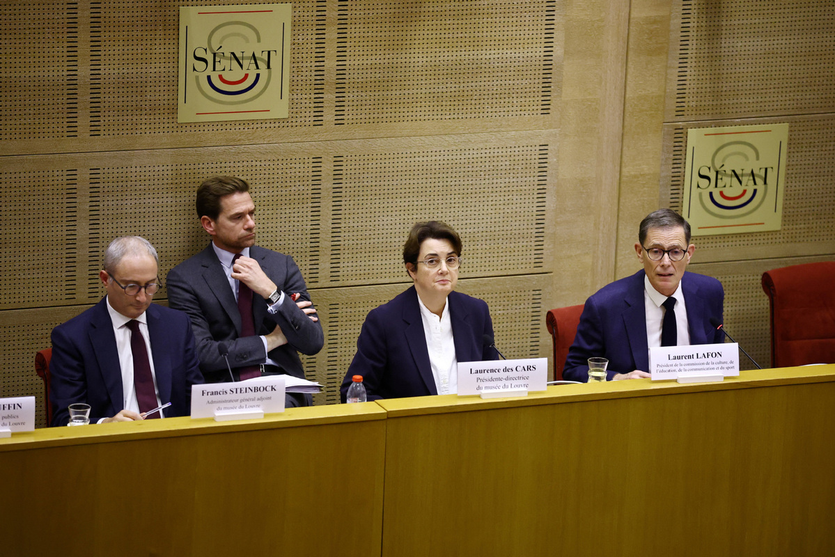 Laurence des Cars, president and director of the Louvre Museum, Francis Steinbock, Deputy General Administrator of the Louvre Museum, Matthias Grolier, Chief of Staff to the President and Director of the Louvre Museum and French Senator Laurent Lafon are seen before the start of a hearing by the Culture, Education, Communication and Sport Commission at the French Senate in Paris, France, Oct 22, 2025. [Photo/Agencies]